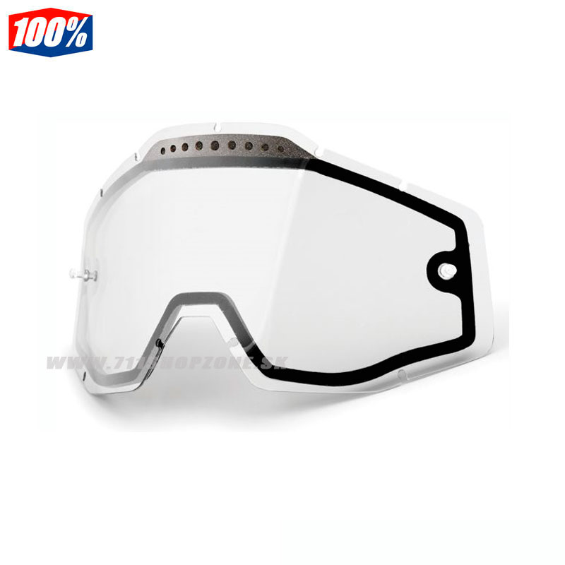 100% Dual Pane Vented Lens – priehľadné Anti Fog náhradné sklo s úchytmi na strhávačky, vhodné najmä na snow, mtb, enduro použitie. Vďaka dvojitému sklu s odvetrávacimi otvormi zabezpečuje maximálnu ochranu proti zahmlievaniu. Filter: 1 (pre stredne jasné až jasné svetelné podmienky) Kompatibilné modely: Racecraft1/Accuri1/Strata1.