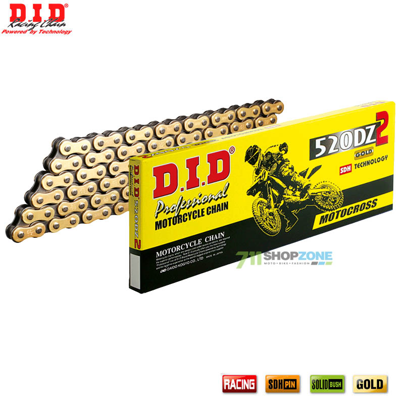 Nová 520DZ2 Gold&Black bola modernizovaná s exkluzívnym SDH Pin - Super Dai Hard D.I.D upraveným kolíkom. Výsledkom toho je, že 520DZ2 G&B má väčšiu odolnosť voči opotrebeniu ako predošlá reťaz DID 520DZ G&B. Kombinácia vysokej odolnosti proti opotrebeniu a skvelá hmotnosť robia z 520DZ2 G&B najlepšiu základnú modelovú reťaz vhodnú pre motokrosové motocykle s obsahom motora do 450cm³
