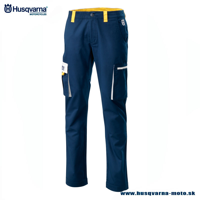 Husqvarna Team Pants - pracovné mechanik nohavice s veľkými praktickými cargo vreckami v štýle Husqvarna Racing Teamu. Na vreckách a páse sú kontrastné žlté detaily. Na bočnom vrecku a na zadnom vrecku je vyšité logo Husqvarna Motorcycles. Materiál: 65% polyester + 35% bavlna.