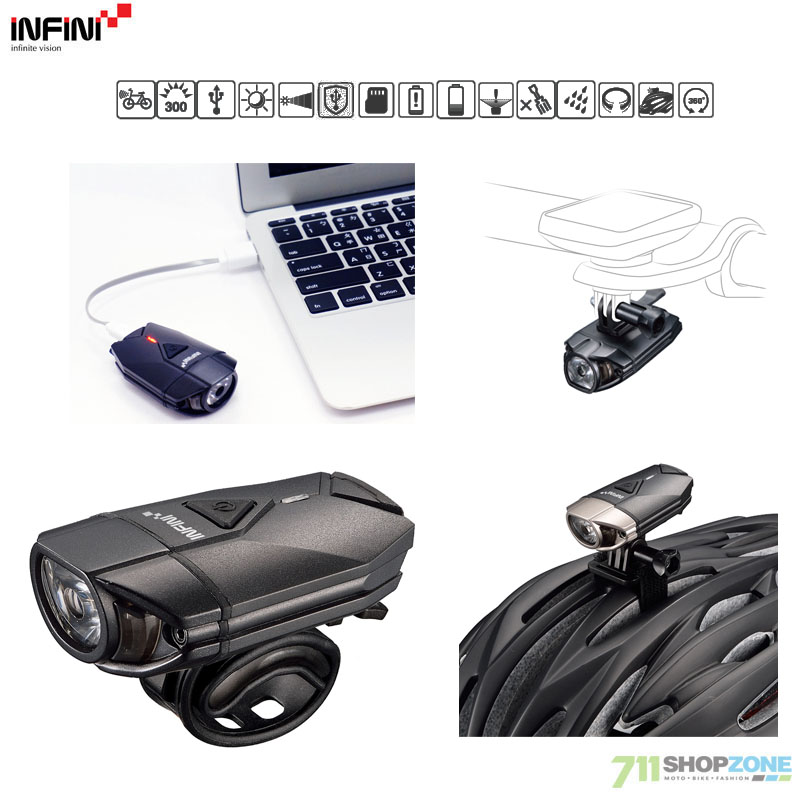 INFINI Super Lava je kompaktné, ľahké, nabíjateľné svetlo. Svetlo má svietivosť až 300 lumenov. Denné blikanie až 600 lúmenov. Unikátny dizajn osvetľuje cestu dopredu a poskytuje dostatočnú viditeľnosť aj po stranách vďaka špeciálnej konštrukcii a zvyšuje bezpečnosť používateľa. Ponúka 4 rôzne svetelné režimy so širokým uhlom svietenia a nabíjaním cez USB. Inštalácia je bez použitia nástrojov, pričom používa pružný gumený úchyt a konzolu pre bezpečné upevnenie. Kompatibilný s montážnym systémom GoPro. Indikátor slabej batérie. Run Time: 8 hodín (konštantné), 4 hodiny (zvýšenie), 2 hodiny (super jasný), 8 hodín (pulzujúce), 8 hodín (blikanie počas dňa), 1-8 hodín (nastaviteľný jas). Doba nabíjania: 3hod. Úchyt na prilbu je súčasťou balenia. Rozmery: 69 x 43 x 24 mm. Váha 54g.