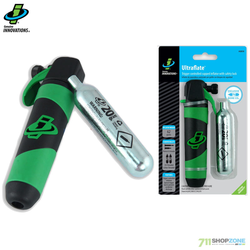 Najpredávanejší CO2 hustilka kolies pneumatík. Vďaka pevnej premyslenej konštrukcii máte pocit bezpečia – chráni vaše ruky od zmrazenej bombičky CO2. Doživotná záruka Vám vždy zaistí stálu pomoc na cestách. Zámok spúšte zabraňuje náhodnej aktivácii. Pre Presta ventil stačí Ultraflate pritlačiť a pre Schrader ventil je potrebné naskrutkovať. Jednoducho vložte CO 2 bombičku do hustilky, zaskrutkujte a priložte k ventilu, odomknite bezpečnostnú západku a stlačte spúšť pre nahustenie kolesa. Kompatibilné so všetkými typmi náhradných bombičiek CO2 (16g a 25g je kompatibilná iba s hustiacou hlavou). Rýchlejšie a jednoduchšie to už nemôže byť! Možno použiť aj na motorky. Hustič s bombičkou váži 62 g.