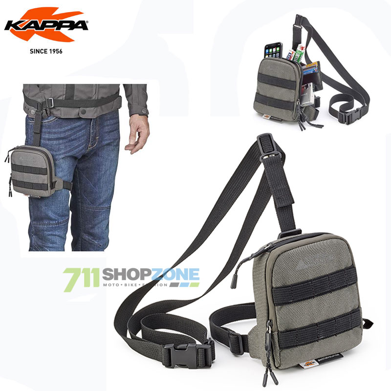 Kappa RA307R2 vynovená univerzálna, ľahká moto taštička na nohu. Taštička má praktický, stredný rozmer. Je určená na doklady, telefón a drobné predmety, ktoré potrebujete mať čo najrýchlejšie po ruke. Upevňuje sa na nohu, s nastaviteľnými popruhmi okolo pásu a stehna. Vrchný materiál je vode odolný a tiež odolný voči UV žiareniu. Taštička obsahuje dve vrecká. Predné vrecko je určené pre telefón alebo iné drobné elektro zariadenie. Má otvor na napájací kábel /cable port/. Perfektnú manipuláciu v rukaviciach zabezpečia spevnené šnúrky na zipsoch. Taštička má na sebe reflexné prvky, ktoré zlepšujú celkovú bezpečnosť jazdca. Rozmery: 18cm x 15cm x 5cm.