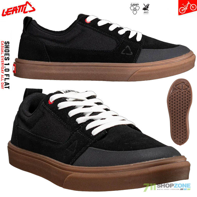 Leatt topánky 1.0 Flat majú vzhľad fashion sneaker, technicky sú však výborne uspôsobené aj na bicyklovanie, či skate. Vďaka svojmu neformálnemu vzhľadu, pohodlnému strihu a kvalitnému vetraniu sú vhodné nie len na každodenné nosenie, ale aj krátke šliapanie do pedálov. Podrážka Sticky Leatt Lab je stredne tuhá, komfortná, vyrobená metódou RideGrip, ktorá zabezpečuje dokonalú priľnavosť topánok k pedálom pri akýchkoľvek podmienkach. V podrážke sú tiež umiestnené odvodové kanály na blato a vodu, ktoré tiež napomáhajú k intenzívnemu kontaktu s pedálmi počas nepriaznivých podmienok. Vnútorné výstelky podrážky spoľahlivo spracovávajú kompresné zaťaženie. Vnútorné stielky s obsahom aktívneho uhlia sú rýchlo schnúce, obsahujú antibakteriálny prostriedok odolný voči zápachu. Zvršok topánky je zo syntetického semišu s DWR úpravou – vode odolným povlakom.