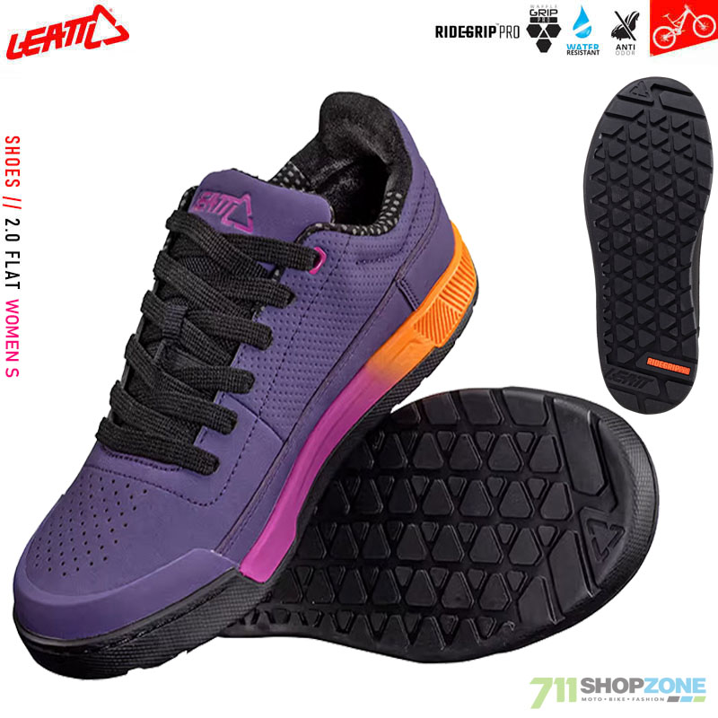 Leatt MTB 2.0 Flat Womens sú skvelé dámske topánky na bicykel určené pre ploché pedále - platformy. Tretry sú vhodné na cross-country, e-bike, gravel, downhill, pumptrack, trail alebo enduro mtb jazdenie. Cyklistické topánky 2.0 flat majú vzhľad fashion sneaker, technicky sú však výborne uspôsobené na bicyklovanie. Vďaka svojmu neformálnemu vzhľadu, pohodlnému strihu a kvalitnému vetraniu sú vhodné aj na celodenné výlety, či krátke prechádzky počas cyklo výletu. Nová podrážka WaffleGrip Pro je stredne tuhá, komfortná, vyrobená metódou RideGrip™PRO, ktorá zabezpečuje dokonalú priľnavosť topánok k pedálom pri akýchkoľvek podmienkach. V podrážke sú tiež umiestnené odvodové kanály na blato a vodu, ktoré tiež napomáhajú k intenzívnemu kontaktu s pedálmi počas nepriaznivých podmienok. Vnútorné výstelky podrážky spoľahlivo spracovávajú kompresné zaťaženie. Vnútorné stielky s obsahom aktívneho uhlia sú rýchlo schnúce, obsahujú antibakteriálny prostriedok odolný voči zápachu. Zvršok topánky je zo syntetického semišu s DWR úpravou – vode odolným povlakom.
