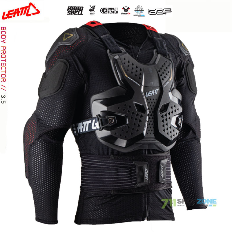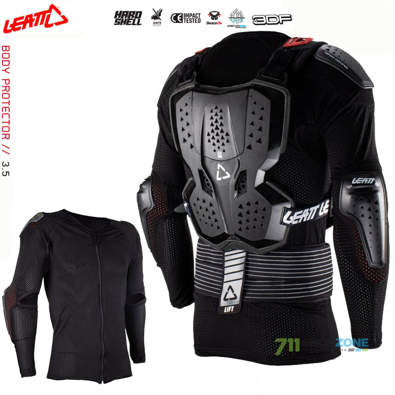 Chránič Body Protector 3.5 pozostáva z 2 kusov - zipsový kompresný návlek so zabudovanými 3DF AirFit chráničmi ramien a lakťov a tiež výškovo nastaviteľný ľadvinový pás a pevný plastový chránič hrudníka a chrbta s certifikátom CE. Tento modulárny systém poskytne nielen maximálnu ochranu, ale aj skvelú ventiláciu a pohodlie. Chránič sa veľmi ľahko oblieka a vyzlieka, jeho údržba a čistenie je veľmi jednoduché. Je riešený tak, aby bol kompatibilný s krčným chráničom Leatt. Spĺňa normu EN1621-2. Spĺňa tiež náročné kritéria FIM a FFM.