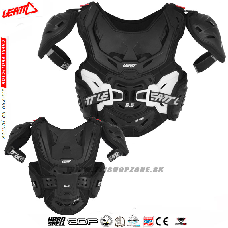 detský chránič z línie 5.5 je najvyššou radou v portfóliu výrobcu. Je špeciálne navrhnutý tak, aby zabezpečoval maximálnu ochranu hrude, chrbta a ramien. Trojrozmerný dizajn s ôsmimi multi vrstvami vytvára podmienky pre dokonalú integráciu krčného chrániča, hoci funguje rovnako dobre aj bez jeho použitia. Táto konštrukcia dovoľuje použitie hrudného chrániča v kombinácii s krčným chráničom pod, aj na dres. Systém pružných popruhov BraceOn ™ na pleciach zabezpečuje spojenie s krčným chráničom, ale zároveň nezabraňuje nezávislému pohybu tela, hrudného a krčného chrániča. Tento chránič poskytuje ochranu na úrovni 15 bodov z Leatt 20 bodovej stupnice, čomu napomáha aj použitie ramenných chráničov. Chrbtová časť chrániča spĺňa normu ochrany proti nárazu CE EN1621-2, stupeň 2, hrudníková časť chrániča spĺňa normu ochrany proti nárazu CE EN1621-3, stupeň 2, ramenné diely chrániča spĺňa normu ochrany proti nárazu CE EN1621-1. Takúto extrémnu odolnosť zabezpečilo použitie LEATT 3DF peny v prednej a zadnej časti. 45 otvorov sa stará o maximálne vetranie, vonkajší materiál je z High Density Poly etylén (HDPE), nastaviteľné ramenné popruhy pomáhajú nastaviť správnu polohu prednej a zadnej časti. Veľkosť je určená na výšku postavy od 134 - 159cm.