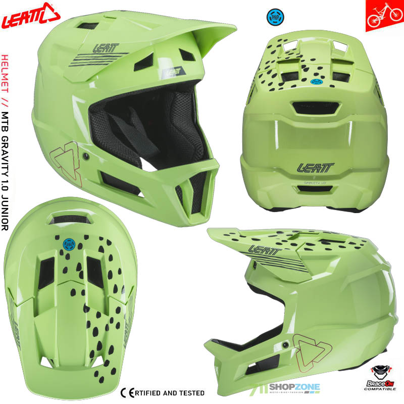 Leatt MTB Gravity 1.0 Junior, deťská, ľahká full face prilba s certifikáciou ASTM Downhill. Vďaka 11- tim otvorom má vynikajúcu ventiláciu s prémiovou bezpečnosťou. Prilba je vybavená technológiou Turbine 360 °, ktorá pomáha znižovať poranenie mozgu pri páde až o 40%. Prilba má strhávací šilt, ktorý taktiež pomáha eliminovať nežiadúcu rotáciu vzniknutú pri páde. Tvar prilby je uspôsobený tak, aby bolo možné nosenie krčného chrániča. Prilba spĺňa certifikáty: AS/NZS 2063: 2008, ASTM F1952–10, EN1078, CPSC 1203. Váha od 920g. Veľkosti: XXS ( 51-52cm) XS (53-54 cm).