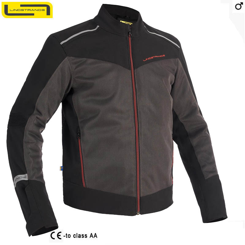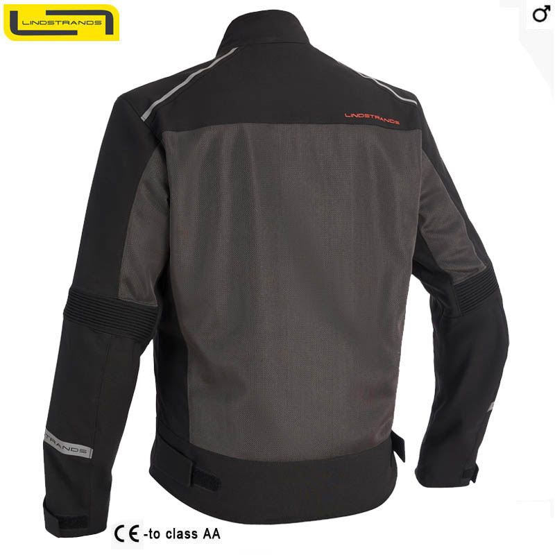 Lindstrands Delsbo nová Flow Tech, cenovo dostupná, ľahká letná bunda s veľkými vetranými dielmi zo sieťoviny a strečovými panelmi. R1 PE Mesh / Polyoxford 450D Stretch PE. Nastaviteľné, CE certifikované chrániče na ramenách a lakťoch, level 2 Certifikované CE, trieda AA. Možnosť doplnenia chrbtovým chráničom. Vode odolné vnútorné vrecko. Má tiež zips na spojenie s nohavicami.