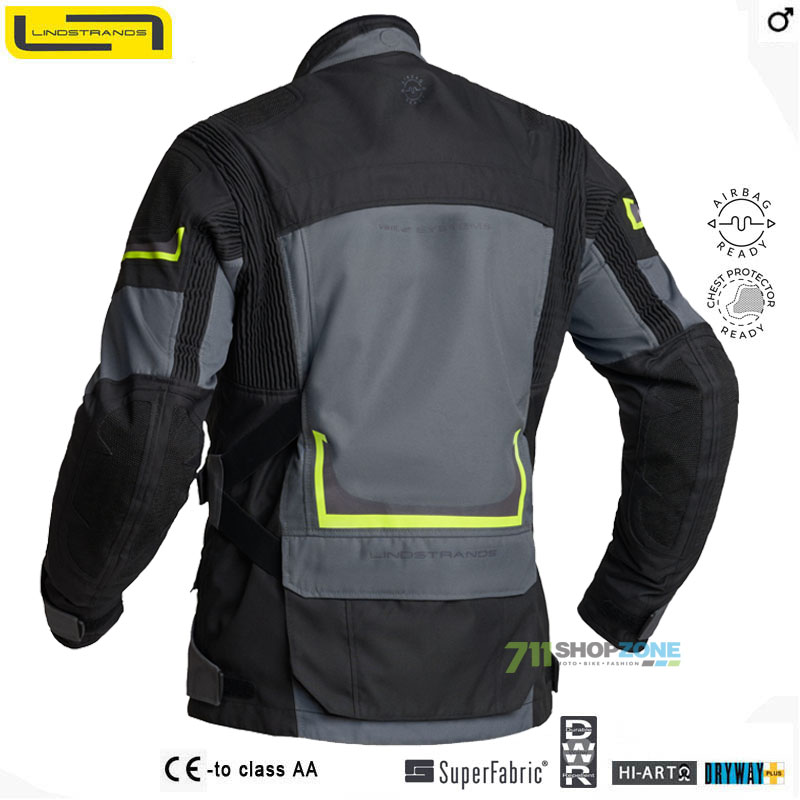 Celoročná adventure bunda do každého počasia, multifunkčná s praktickými riešeniami. Vrchný materiál je z vysoko odolného materiálu s označením 600D, ktorý má DWR úpravu zvyšujúcu odolnosť voči vode. Najnamáhanejšie časti na sú spevnené extra odolným SuperFabric® materiálom. Vode odolnosť podporuje funkčná membrána Dryway + 2,0. Vodný stĺpec: 10 000 mm. Priedušnosť: 30 000 g/m2/24h. Tepelnú izoláciu zabezpečuje odnímateľná vnútorná vesta s termo podšívkou. Chrániče sú certifikované CE trieda AA. Pružnosť a komfort pri nosení zabezpečujú vložené elastické panely. Tepelnú pohodu počas teplého počasia zabezpečujú ventilačné otvory vpredu i vzadu. Bunda má prípravu na vloženie chrbtového chrániča a airbag systému. Golier je odnímateľný. Bunda je vybavená vnútorným zipsom, ktorý sa dá spojiť s nohavicami. Certifikácia CE EN 17092-3:2020, trieda AA.
