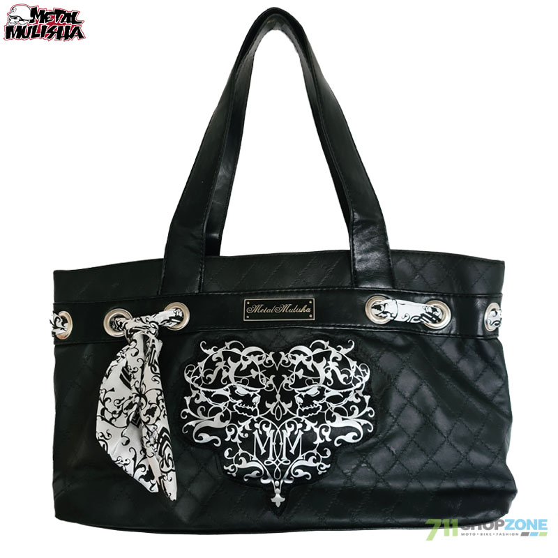 štýlová dámska kabelka americkej značky Metal Mulisha je vyrobená z eko kože v matnom dizajne, ktorý je ozvláštnený ozdobnou mašľou a saténovou aplikáciou. Kabelka má kontrastnú bielo čiernu podšívku s viacerými praktickými vreckami. Rozmer 35x21x10 cm.