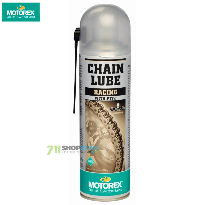 Motorex CHAINLUBE Racing, vysoko kvalitné mazivo na reťaz v spray. Revolučná formula proti opotrebeniu reťaze a reťazových kolies. Biele, teflónom spevnené špeciálne mazivo s extrémnymi priľnavými vlastnosťami, vhodné pre všetky typy reťazí, obzvlášť pre reťaze s X a O-krúžkami. Extrémne odolné proti preklzu, odolné proti vode a teplotne stabilné. Balenie: 500ml