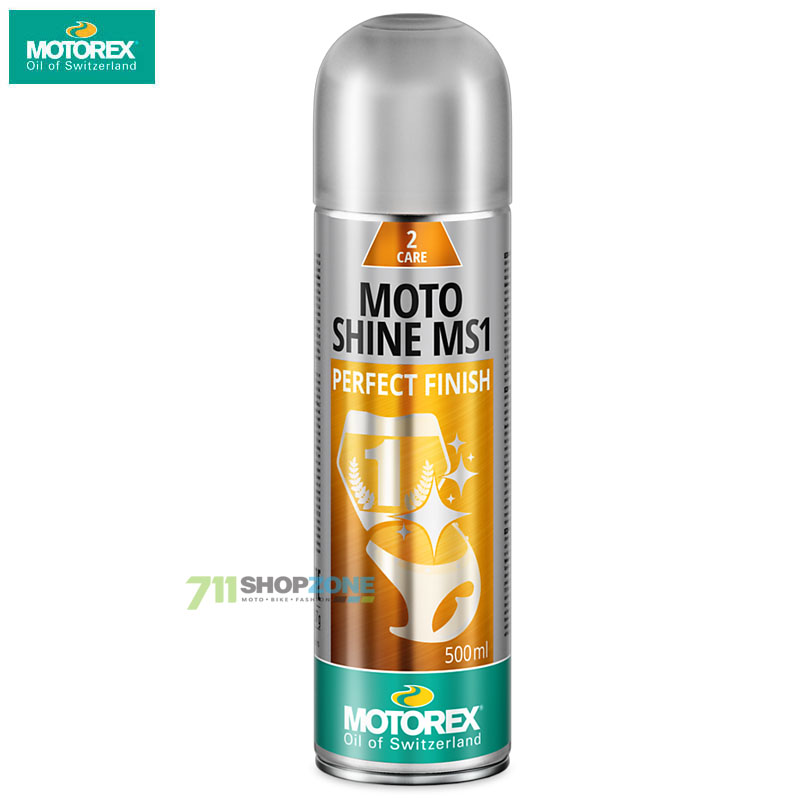 Motorex Moto Sine perfekt Finish , špeciálny lesklý sprej pre dokonalý výsledok po čistení vozidla. Poskytuje dlhotrvajúci lesk laku, plastu, chrómu atď. a vytvára antistatický ochranný film s vodo odpudivým účinkom, tvorba vodných guľôčok. Je tiež ideálny pre veľtrhové a výstavné vozidlá. Moto Shine má veľmi príjemnú čerešňovú vôňu. Poznámka: Moto Shine MS, určený najmä na použitie na pretekárskej dráhe, optimálne rozpúšťa a čistí aj oder pneumatík a asfaltovú špinu. Balenie: 500ml