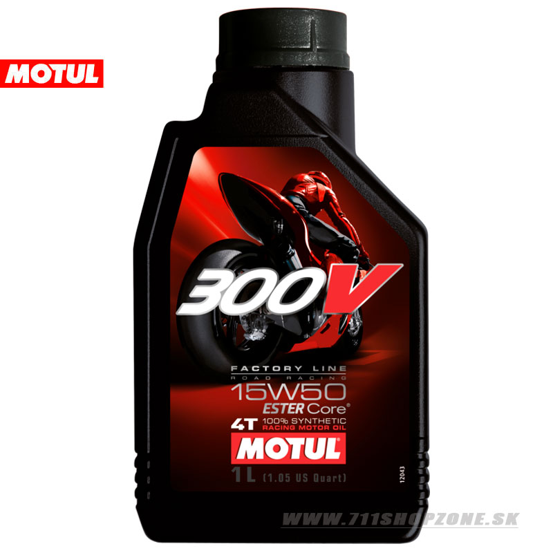 100% syntetický štvortatktný pretekársky olej vyvinutý pre továrenské tímy. 300V Factory Line ťaží z technológie ESTER Core®, aby bolo možné zaistiť maximálny výkon motora bez kompromisov na úkor spoľahlivosti a opotrebenia. Voľbou esterov pred ostatnými vysoko výkonnými syntetickými základmi a ich kombináciou s ďalšími inovatívnymi vlastnosťami, vytvorila značka MOTUL perfektnú synergiu pre motor, prevodovku a spojku. Je vhodný najmä pre závodné účely i pre použitie v motoroch konvenčných cestovných, terénnych a enduro motocyklov. Nakoľko tento olej odoláva veľmi vysokým teplotám, je veľmi účinný proti opotrebeniu motora, zanecháva stabilný olejový film, ktorý zaisťuje plný výkon v každom režime otáčok aj v dlhodobo extrémnych podmienkach. Vysoko prekračuje všetky aktuálne normy API a CCMC ( ACEA ).