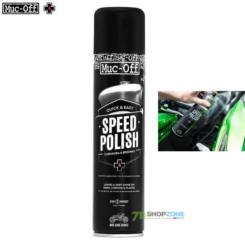 Muc-Off Speed Polish prináša rýchle a ľahké použitie pre vyleštenie povrchu do posledného detailu. Obsahuje čistý karnaubový vosk (najtvrdší známy prírodný vosk) dodávajúci leštidlu potrebnú odolnosť a včelí vosk, ktorý dodáva všetkým ošetreným častiam potrebný hlboký lesk. Vďaka svojmu zloženiu tak rýchlo a jednoducho vytvára odolnú bariéru, ktorá účinne chráni kovové, plastové, lakované alebo chrómové časti najmä proti vode a vlhkosti. Po aplikácii nezanecháva žiadne nežiaduce biele zbytky. Aplikácia: Pred použitím doporučujeme Speed Polish dôkladne pretrepať, aby došlo k aktivácii všetkých jeho zložiek. Následne prípravok nastriekajte na ošetrované časti a ihneď vyleštite jemnou a čistou utierkou z mikrovlákna do vysokého lesku.