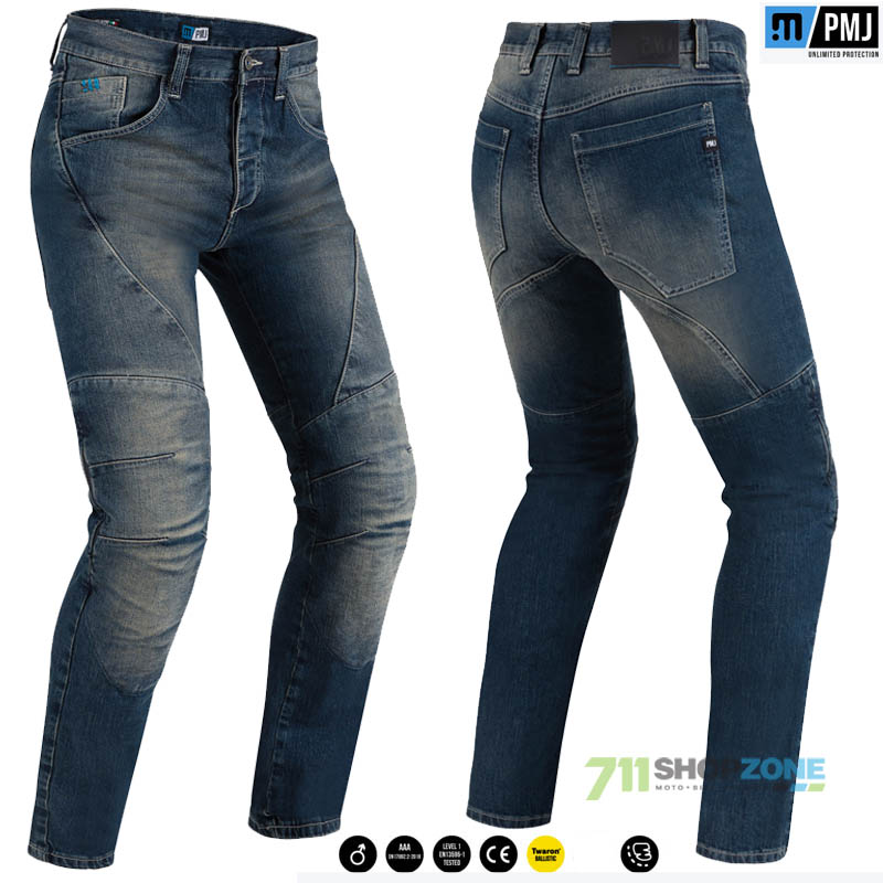 Dallas PMJeans sú špičkové motorkárske jeansy vyrábané výhradne v Taliansku. Výrobca kladie maximálny dôraz nie len na štýlový dizajn, ale hlavne na kvalitu použitých materiálov a samotný výrobný proces. Základom je vysoko hmotnostná elastická bavlna 375g/m2 v kombinácii s unikátnym materiálom Twaron®, ktorý je extrémne odolný voči oderu, je 5x pevnejší ako oceľ, je vysoko tepelne odolný, takmer nehorľavý, je používaný pri výrobe nepriestrelných viest. Twaron je vkladaný vo všetkých najnamáhanejších partiách. Odnímateľné a nastaviteľné penové kolenné chrániče sú certifikované CE 1621-1. V nohaviciach sú umiestnené chrániče bokov Knox, ktoré sú odnímateľné, spĺňajú normu CE1621-1. V zadnej pásovej časti sa nachádza pútko pre zopnutie s bundou.