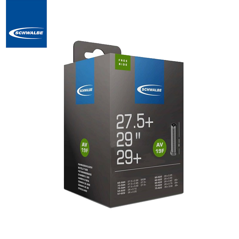 Schwalbe duša je extrémne pružná a hodí sa na niekoľko rozmerov plášťov. Z tohto dôvoduju tiež nazývame "Group Tube”. Napríklad duša19AV zapadá do rozmerov plášťov od 27,5" do29" a šírky od 40mm do 62mm. Auto ventil 40mm. Použitelnosť: 27,5"x2,60 - 29"x3,00