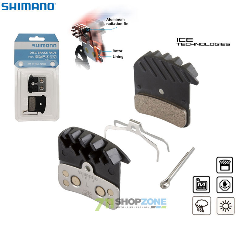 Shimano Disc Brake Pads - brzdové platničky metal s chladičom H03C. ICE tecchnology. Typ: E-Bike, MTB. Vhodné do všetkých poveternostných podmienok. Celková váha: 55g. Balené po: 1 pár. Materiál: Oceľ/sinter-zlepovaná/. Vhodné pre: SAINT, ZEE, XTR, XT, SLX, ALFINE, BR-M8020, 640, 820