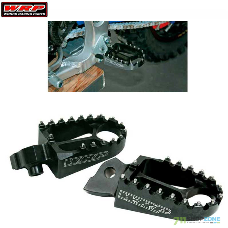 Hliníkové stupačky od talianskeho výrobcu WRP vyrobené technológiou CNC z hliníku 7075-T6. Nielen že sú ľahké ale majú aj vylepšenú širšiu oblasť podpory nohy pre zlepšenie rovnováhy jazdca. Anodizovaná antikorózna povrchová úprava. Motocykel: Kawasaki KX-F 250 06-, KX-F 450 07-